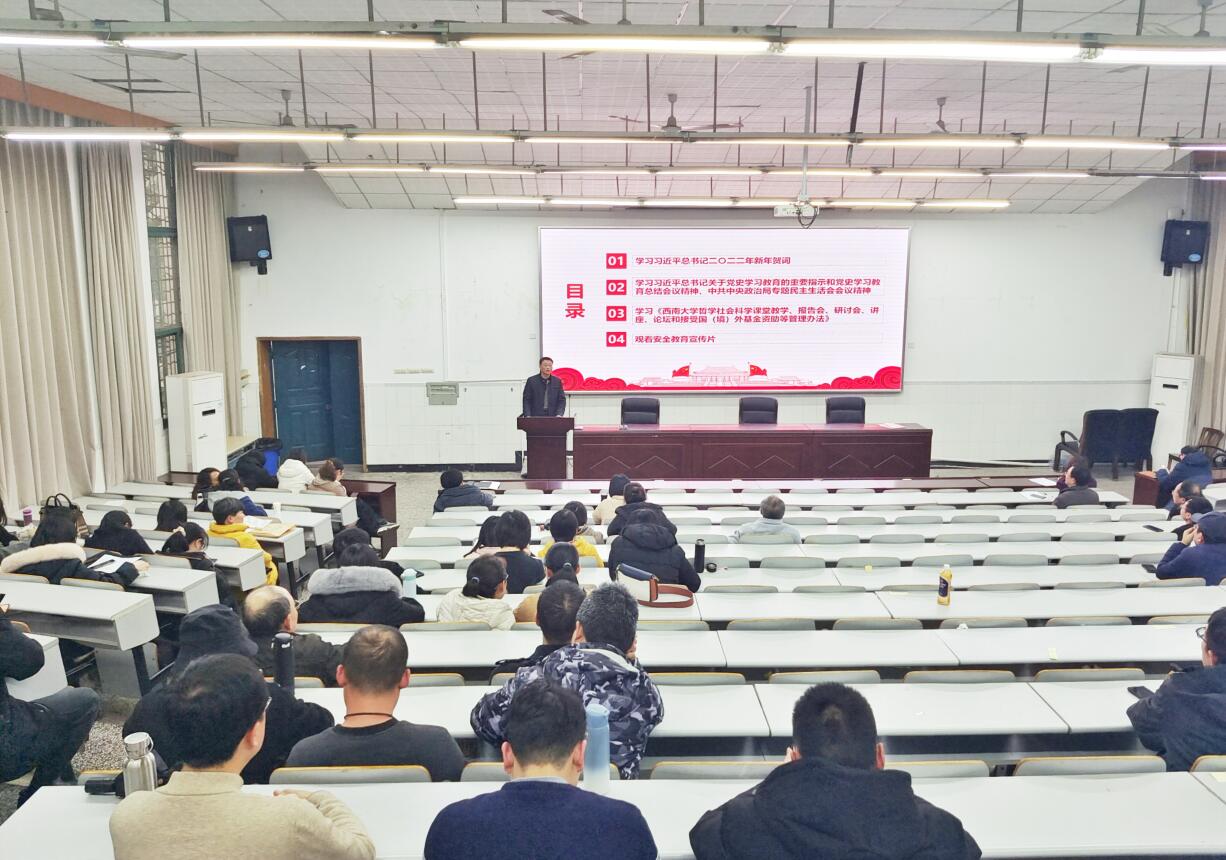 根据学校党委统一部署,1月7日下午,亚洲av 在大阶梯教室举行2022年第一次教职工政治理论学习会。学习会由亚洲av 党委书记李余廷主持,亚洲av 全体教职工参加了此次学习。