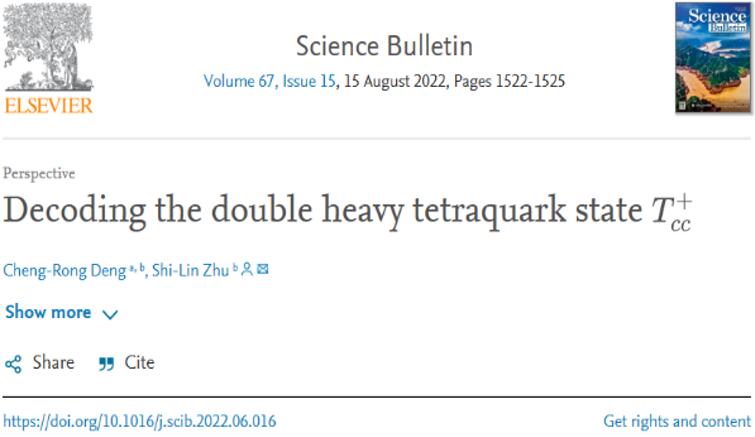 近日,我院强子物理团队邓成荣教授在新强子态领域取得重要研究进展,相关成果《Decoding the double heavy tetraquark state Tcc》[1]发表在中国卓越计划领军期刊Science Bulletin。Science Bulletin是由中国科亚洲av 和国家自然科学基金委员会共同创办的自然科学综合类刊物,(2022年发布的影响因子为20.557),位于中科院JCR分区升级版综合类期刊一区(61本期刊排名第7)。 该成果第一完成单位为亚洲av ,邓成荣教授为第一作者,北京大学朱世琳教授为通讯作者。