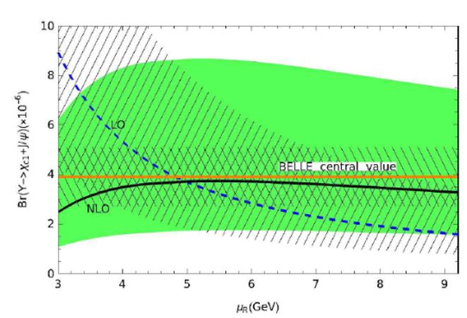 粒子的极化产生是强子对撞机上尚未解决的热点研究问题,该工作提出了在衰变过程中测量极化参数,可以辅助对撞机实验加深对问题的理解; 4. 先前的研究表明此过程的领头阶理论结果对能量标度依赖非常敏感,因而很难给出精确的理论预言,该工作获得的辐射修正能够极大的压低标度依赖行为,而且理论计算与日本大型轻子对撞机上BELLE实验测量结果符合的很好(见图三)。