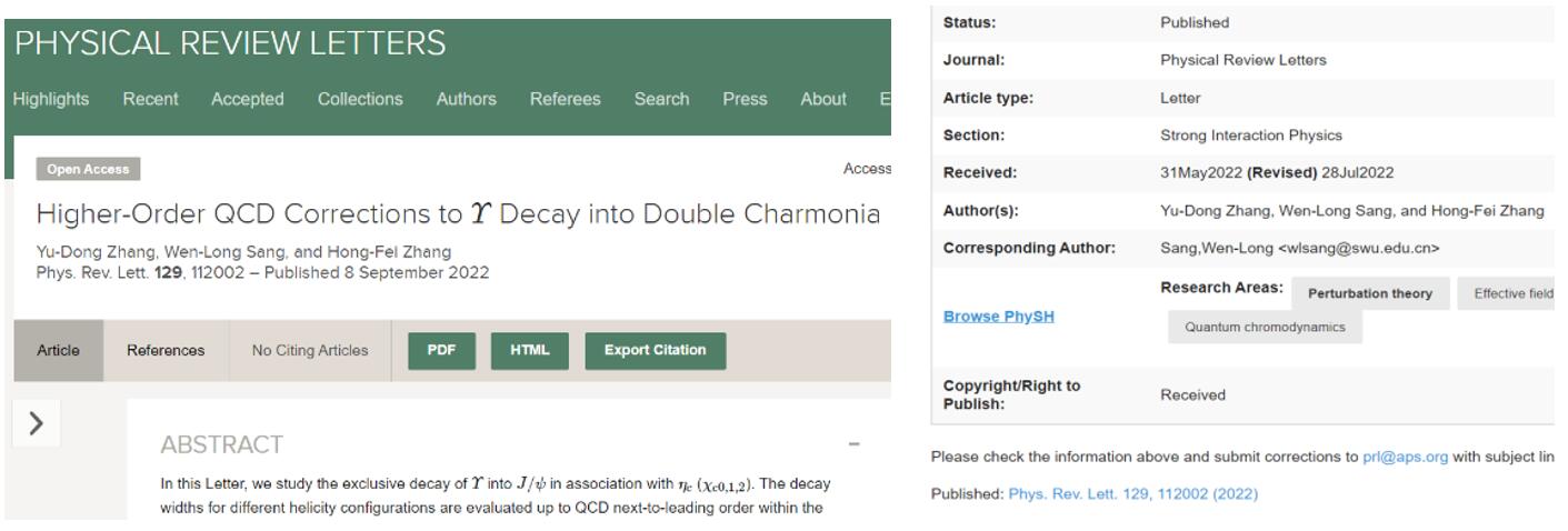 近日我院强子物理团队桑文龙教授与研究生张余栋同学及贵州财经大学的张鸿飞老师在物理学顶级期刊《物理评论快报》(PRL)上发表题为“Higher-order QCD corrections to Upsilon decay into double charmonia”的科研工作,亚洲av 为该成果的第一及唯一通讯作者完成单位,其中张余栋同学为第一作者,桑文龙老师为唯一通讯作者。该研究工作得到了国家自然科学基金面上基金资助。